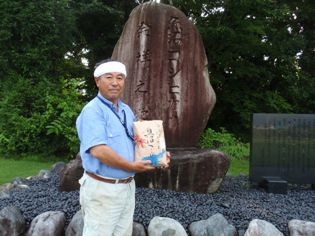 島田徳重さんに記念碑の前で、島田さん自らが作られたコシヒカリと共に